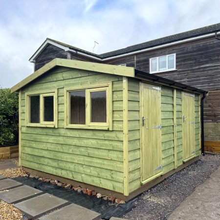 Another stalwart timber shed built to last as with any of our buildings. Machined to order 200mm/8″ rebated feather-edge cladding coupled with a georgian window gives it a period look.